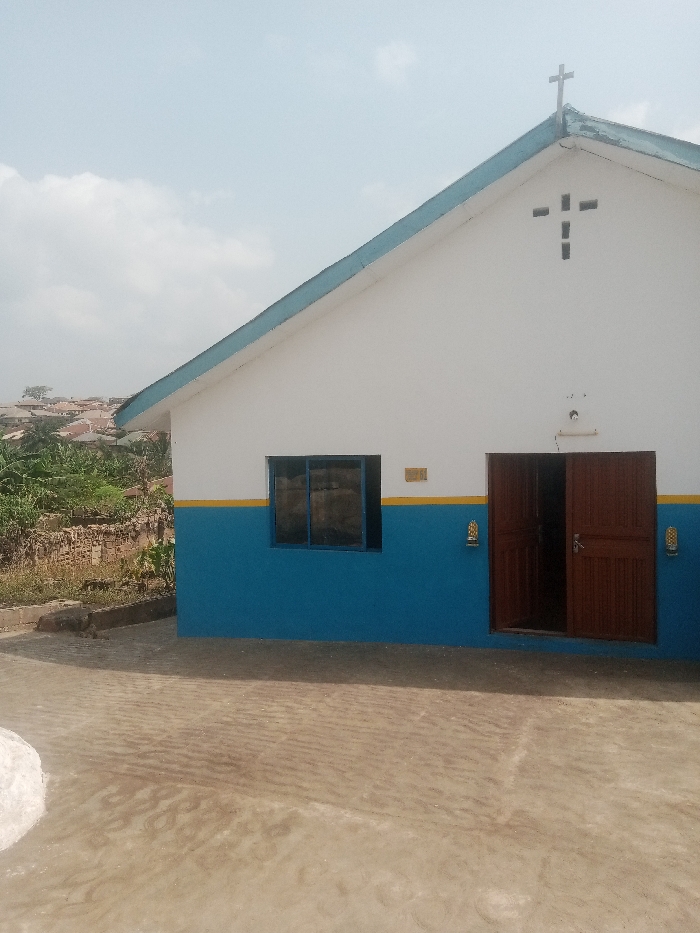This image depicts the exterior of a building in Alade, Nigeria, under a clear, hazy sky. The structure features a white gable facade with a pale blue roof edge and a metallic cross finial at its apex. A smaller cross-shaped ventilation cutout is present on the upper white section of the facade. The lower half of the building's exterior wall is painted a medium blue, separated from the white upper section by a thin yellow horizontal stripe. To the right, a pair of wooden double doors, dark brown in color, stands partially ajar, revealing a shadowed interior. Two ornate, gold-colored wall-mounted lights are positioned on either side of the doors on the blue wall section. To the left of the doors, a horizontal rectangular window with a blue frame is visible, its panes reflecting the sky and surroundings. The ground in front of the building is a light-colored, possibly concrete or paved surface with visible patterns, extending into the foreground. To the left of the building, the terrain slopes downwards, revealing dense green foliage, several smaller buildings or structures with reddish roofs, and a distant, larger tree. No people, discernible actions, or direct interactions are visible in the scene.