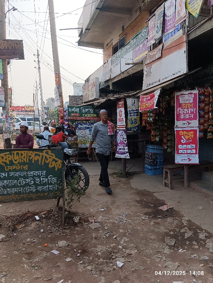 This image depicts a bustling street scene in Kaliganj, Bangladesh, recorded at 14:08 on December 4, 2025. The immediate foreground shows uneven, compacted dirt ground extensively littered with paper fragments, plastic, and small debris. On the left, a vertical green sign with white Bengali text, likely indicating "F. Diagnostics" and listing medical tests, stands next to a small green plant rooted in the dirt. A male subject, appearing middle-aged to elderly, walks forward in the center of the frame. He wears a light grey short-sleeved collared shirt, dark trousers, dark shoes, and a white skullcap, with a red and white checkered cloth draped over his left shoulder. To his left, another male subject, appearing younger, is seated on a low wooden bench, dressed in a maroon long-sleeved shirt and a white skullcap. A dark-colored motorcycle is partially visible behind the seated individual. The midground features a commercial establishment on the right, displaying numerous bags of snacks hanging from an awning. Multiple colorful banners and posters, primarily in Bengali, are affixed to the building and utility poles, advertising services such as "Bikash" and various products. A stack of blue plastic water bottles is visible near the store's entrance, adjacent to a small, dark wooden stool. The street extends into the background, lined with numerous utility poles supporting a dense network of overhead electrical and communication wires. Further down the street, additional indistinct figures, a white van, and other vehicles are present. The background also includes a multi-story concrete building with an overhanging roof structure. The sky overhead appears bright and hazy.