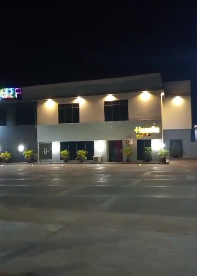 The video opens on an empty, well-lit parking lot in front of a modern, two-story building at night. The building has a flat roof, large windows, and potted plants at the entrance. A sign with colorful lights sits above the entrance, and the building is illuminated by spotlights. A man wearing a dark jacket, light shirt, and sweatpants walks into the frame. He gestures towards the building and then walks out of the frame, followed by a motorcycle, which quickly exits the frame as well. The camera then pans back to a static view of the building and parking lot. The scene is quiet, and the moon is visible in the night sky.