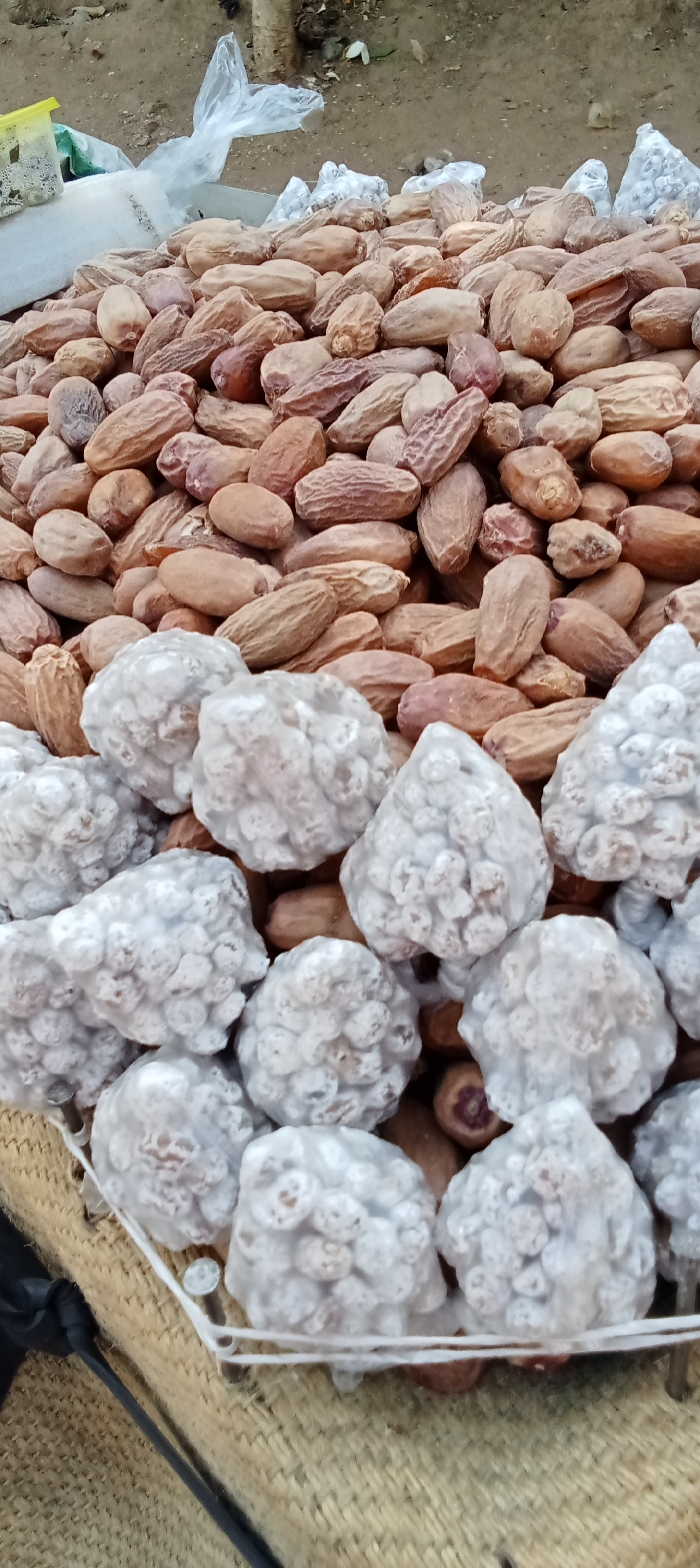 The scene, located in Kabala, Nigeria, depicts a close-up, ground-level view of two distinct food product displays. The upper two-thirds of the frame are dominated by a substantial, loose pile of dried dates, which vary in color from light tan to dark reddish-brown, exhibiting both wrinkled and smooth textures. In the foreground, approximately twelve spherical-to-conical objects with uniformly white, textured, and lumpy surfaces are arranged on a light brown woven mat or basket, secured by thin white string. These white objects appear to be a type of confectionery or sugar-coated fruit. The background consists of exposed, light brown soil. Ancillary objects include a translucent yellow container and multiple white plastic bags, some containing items identical to the foreground white objects, visible in the upper left and right areas of the frame. No individuals, direct actions, or interactions are observable within the frame.