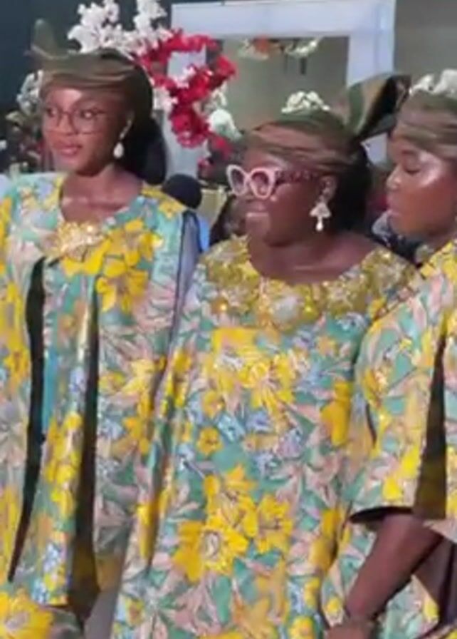 three women standing in a brightly lit, indoor venue that appears to be a wedding or formal event. The women wear matching outfits: long-sleeved, green and yellow floral print tunics and pants, and matching headwraps. The woman in the middle wears large pink-tinted glasses and stands slightly ahead of the other two. There are other people, including children in formal dresses, visible in the background. Decorations such as white columns and floral arrangements are also present. Pictures are hanging on the walls in the background. The women are smiling, and the camera pans slightly, showing more of the venue and guests.