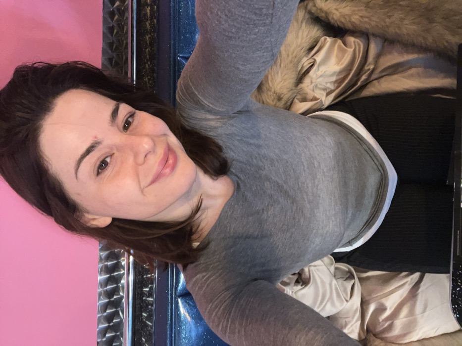 A woman with dark hair smiles at the camera. She wears a gray long-sleeved shirt and dark pants, sitting on a bed with beige bedding and a fur throw. A blue headboard with silver trim is visible. The wall behind her head is pink. The photo has been rotated.