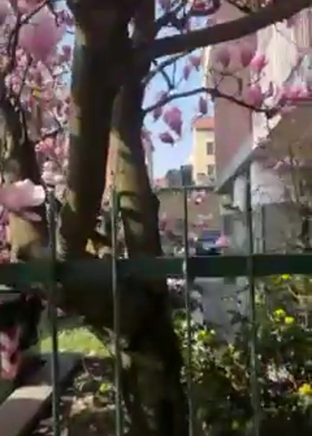 A hand holds a martisor, a twisted red and white thread bracelet, in front of a blossoming magnolia tree. The hand then places the martisor on a branch of the tree. Pink magnolia petals lie on the ground near a fence. The sky is blue.