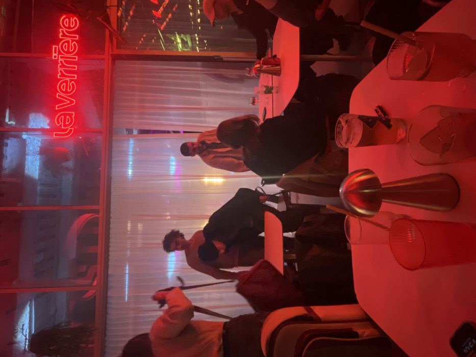 The image depicts the interior of "La Verrière," a restaurant/bar located at 12 Place Louise de Bettignies, 59000 Lille, France. The scene is illuminated by a strong red ambient light, with a prominent red neon sign reading "La verrière" visible above large windows or glass panels. Below these panels are white translucent curtains. In the foreground, a white table holds several items: a metallic, mushroom-shaped table lamp, a clear glass with a straw and red liquid, another clear glass with water and a straw, a pint glass containing beer, and a tumbler with ice and a lime wedge. A smartphone is partially visible on the bottom left. In the mid-ground, a group of approximately seven individuals is visible. On the left, a person with dark hair, wearing a light-colored top, stands operating a black tripod-like object. Next to them, a man with dark curly hair and a mustache, wearing a light brown top, stands looking downwards. A person in a dark top is bent over, partially obscured, near a red bag on the floor. To the right, another man with short dark hair and a beard, wearing a light jacket, stands. Further right, two individuals are seated at a white table: one person with dark hair, wearing a dark top, is partially turned away, and another person wearing a light baseball cap is seated, facing left. The tables are white and square, with minimal decor. Hanging plants are visible near the upper windows. The overall atmosphere is dim and social.