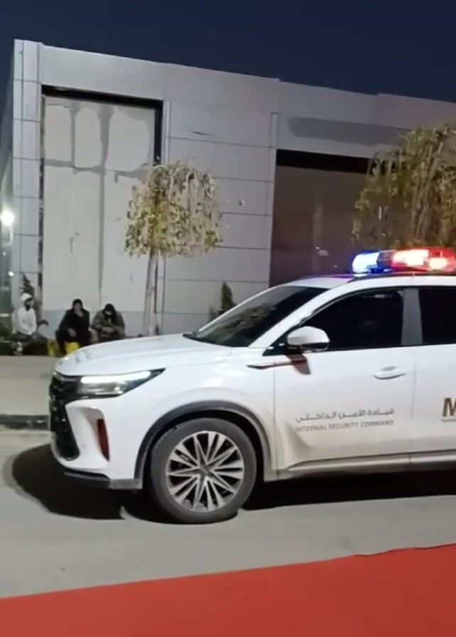 A white police SUV with flashing red and blue lights on top is parked on a red carpet in front of a modern building at night. The vehicle is labeled "MOI INTERNAL SECURITY COMMAND" in both Arabic and English. Three people are seated on the ground near the building to the left of the vehicle. The sky is dark.