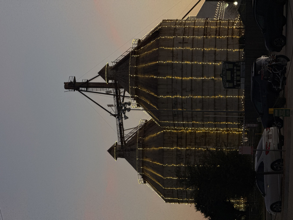 Two large, old silos are adorned with strings of lights. The silos are connected by a metal structure with various lights and machinery. Cars are parked along the side of the silos, and a stop sign is visible. The sky is a pale, dusky color, suggesting it is either dawn or dusk. The overall scene conveys a sense of history combined with a festive or decorative touch.