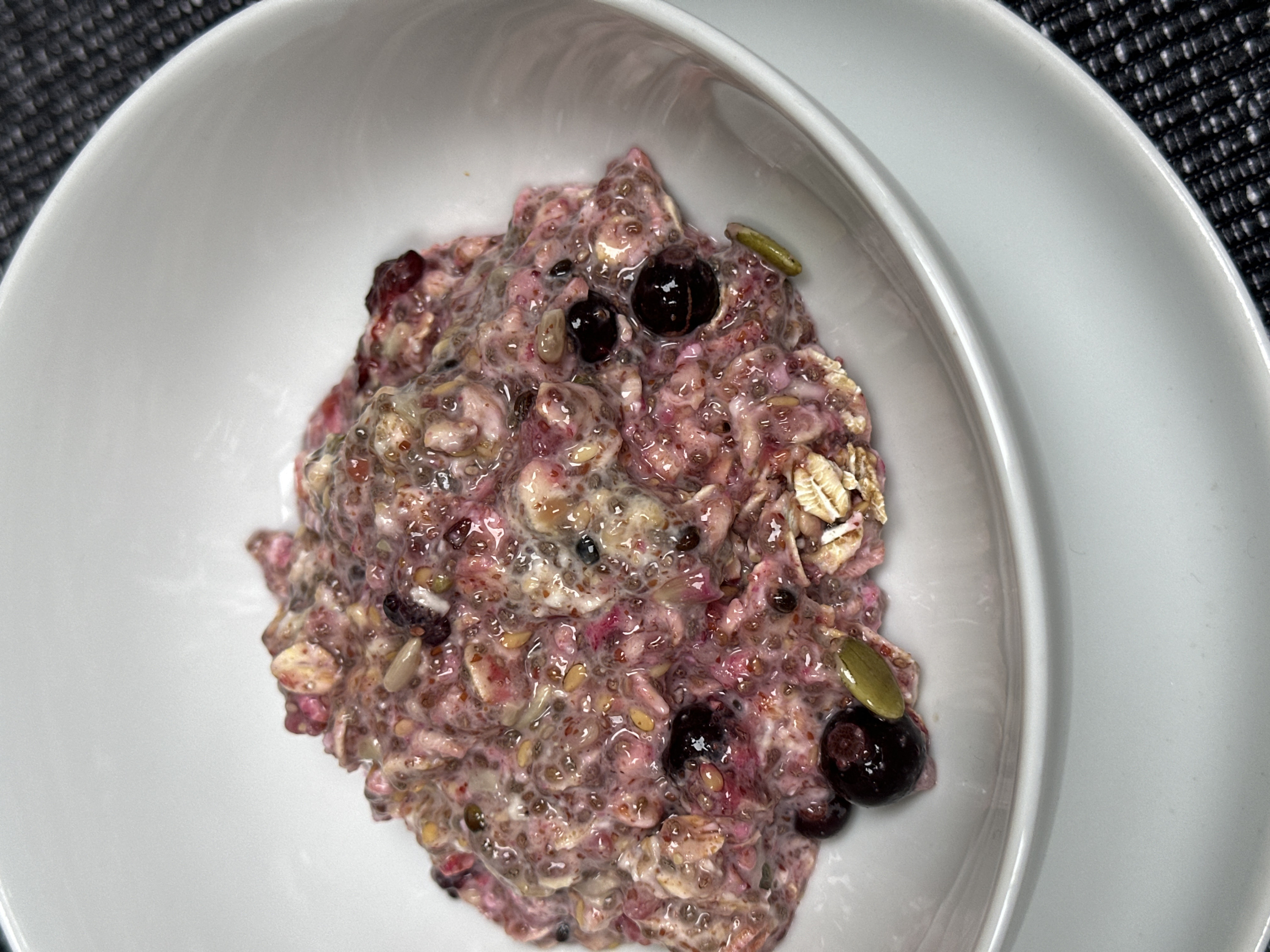 A close-up, top-down image depicts a serving of overnight oats or a similar mixed berry and grain breakfast item contained within a white ceramic bowl