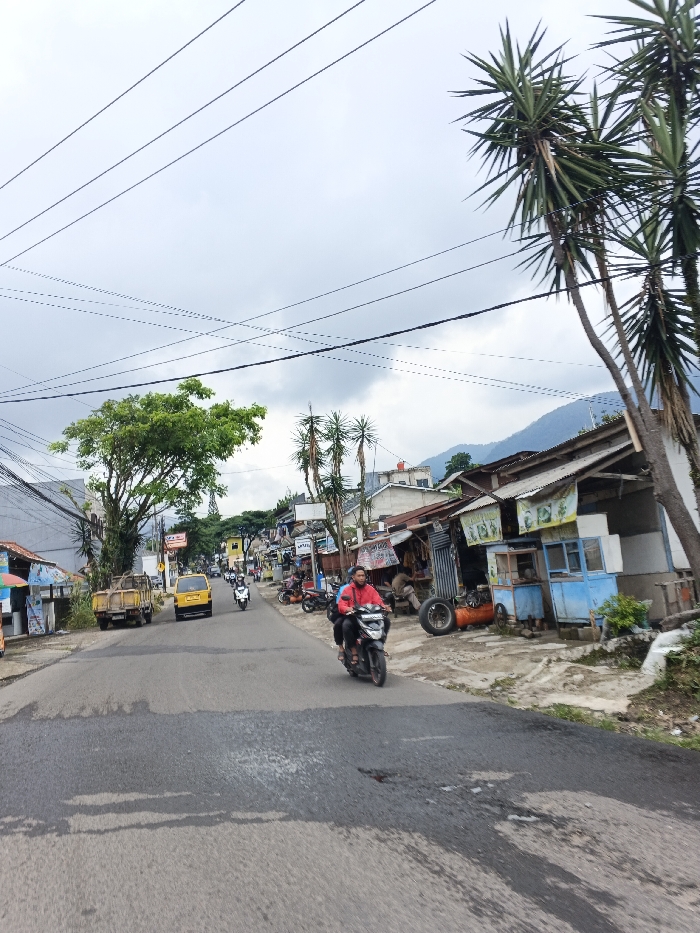 The scene depicts a street in Dagami, Philippines, under an overcast sky. The asphalt road, showing signs of wear and repair with dark patches, extends into the distance, curving slightly to the left. In the foreground, a dark-colored motorcycle travels toward the viewer, slightly to the right of the road's center. The driver wears a red long-sleeved shirt or jacket, dark pants, and a dark helmet. A passenger is seated behind the driver, also wearing a dark helmet and dark clothing. To the left, a light-colored utility truck is parked facing away from the viewer. Further down the road, a yellow utility vehicle or van is visible, also facing away. Several other motorcycles are present further up the road, some moving, some parked. The right side of the road is lined with various structures, appearing to be small shops or residences. These buildings feature corrugated metal roofs and walls, along with some painted blue and light-colored sections. One structure has a visible blue service counter. An orange compressor and a tire are outside one of these establishments. Several tall, slender trees with spiky, palm-like foliage are prominent on this side. The left side of the road also features buildings and a large green-leafed tree. Overhead, numerous black electrical or communication lines crisscross the sky. In the background, distant mountains are visible beneath the cloud cover, suggesting a mountainous or hilly terrain surrounding the city.
