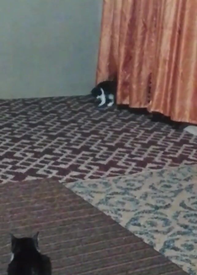 room with two black and white cats. One cat is sitting on a brown carpet in the foreground, facing away from the camera. The other cat is standing near a peach-colored curtain in the background. The floor has a patterned rug with brown, white, and blue designs. The wall behind the cats is light gray. The video is somewhat dark and slightly out of focus. The cat near the curtain briefly moves slightly before disappearing from view.
