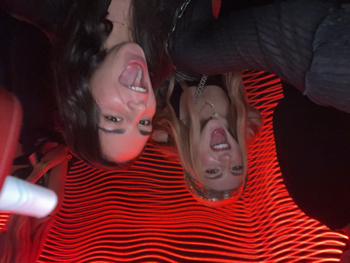 Two women are captured in a skewed, upside-down selfie. One woman has dark hair and the other has light hair. Both have their mouths open with their tongues visible. They are posing in front of a backdrop of wavy, bright red horizontal stripes. Both are wearing necklaces. The image has a dark, nighttime aesthetic with an apparent emphasis on the red lighting.