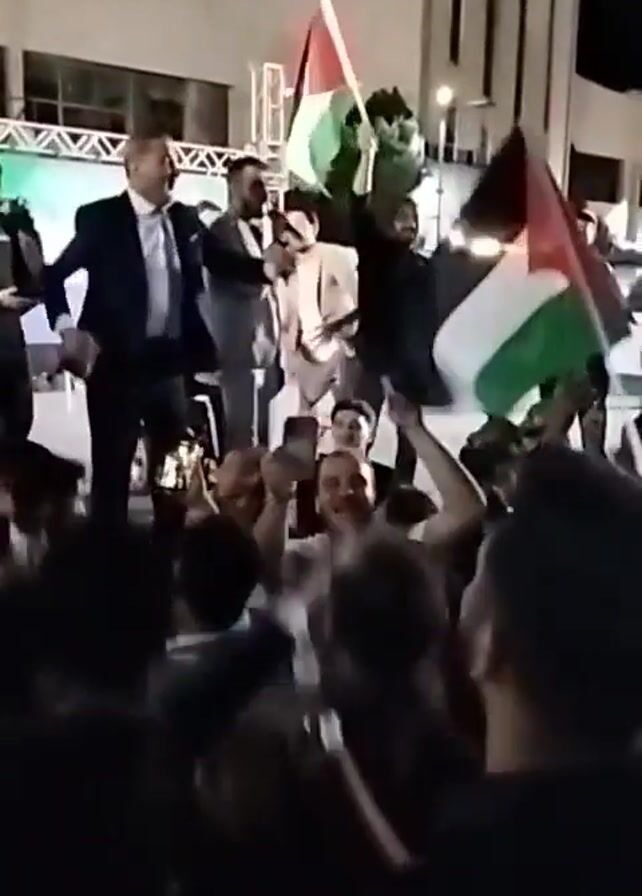 crowd of people celebrating in front of a stage at night. On the stage, several men are standing, some in suits, one of whom seems to be addressing the crowd with a microphone. The crowd is cheering, raising their hands, and several are holding Palestinian flags. The setting appears to be an outdoor public space with buildings in the background. The atmosphere suggests a political rally or a celebration with a nationalistic theme.