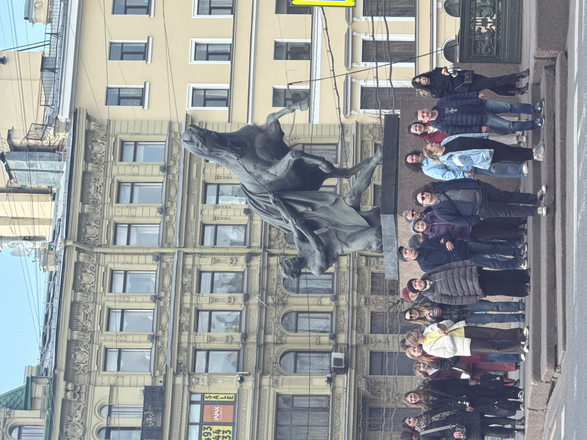 The image captures an urban scene in Saint Petersburg, Russia, focusing on one of the "Horse Tamers" sculptures on the Anichkov Bridge