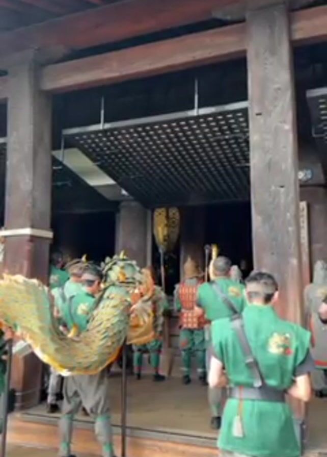 A group of people dressed in green and orange outfits is standing under a wooden structure. Some are holding a large, ornate dragon figure, with the head visible in the foreground. The dragon is gold and green and appears to be made of scales. Some other people are holding up signs or banners with Japanese characters. The structure has a lattice-like ceiling and wooden pillars. The overall setting appears to be a traditional Japanese building or temple.