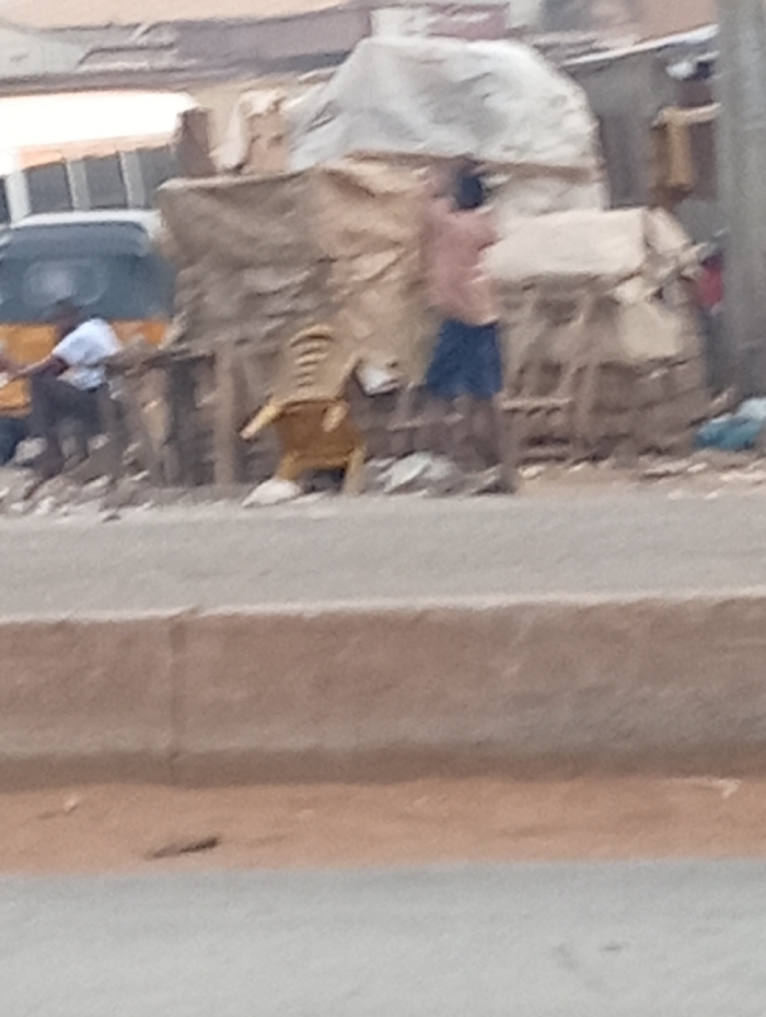 A hazy roadside scene. An auto rickshaw is partially visible on the left. A man wearing a white shirt is near the rickshaw. Adjacent to him, a tan chair is positioned near makeshift stalls covered in fabric or tarps. Another man, shirtless and wearing blue shorts, is standing near the stalls. The foreground is a concrete barrier. The overall scene appears to be a busy or informal commercial area.