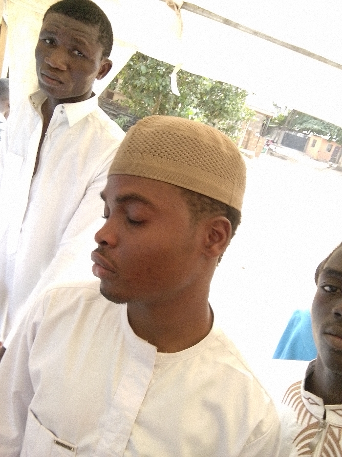 Three men stand close to the camera outdoors. One wears a white button-down shirt, looking toward the lens. Another, wearing a knitted cap and a white traditional garment, gazes downward. The third is partially visible on the right side of the frame, also wearing a traditional patterned shirt. The background reveals trees and a house, suggesting a residential area. The overall lighting is bright.