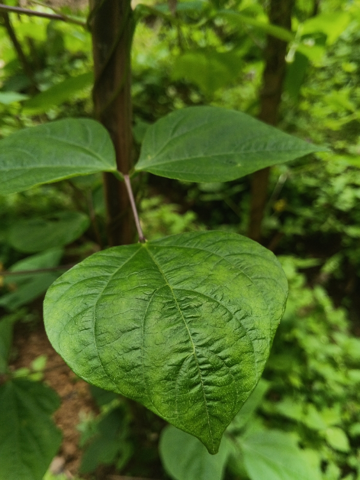 The image displays a close-up, vertical shot of green foliage in a natural environment, located in Bình Hải, Vietnam. In the immediate foreground, a single, large, vibrant green leaf is prominently featured and sharply in focus. This leaf exhibits a cordate to broadly ovate shape with visible, impressed venation and a slightly textured or rugose surface. Extending upward from behind this leaf is a slender, purplish-brown stem, partially obscured by the foreground leaf. This stem appears to be part of a climbing plant or vine, as it is seen entwining around a thicker, darker brown, vertical support structure, possibly a tree trunk or another plant stem. Attached to the purplish-brown stem are two smaller, deep green leaves, positioned symmetrically above the main foreground leaf, and rendered slightly out of focus. The background consists of a heavily blurred expanse of green vegetation, indicating a dense arrangement of plants and leaves, with indistinct shadows and highlights. No human figures, animals, or artificial objects are present in the frame. The lighting suggests natural daylight, illuminating the leaves and creating variations in green tones.
