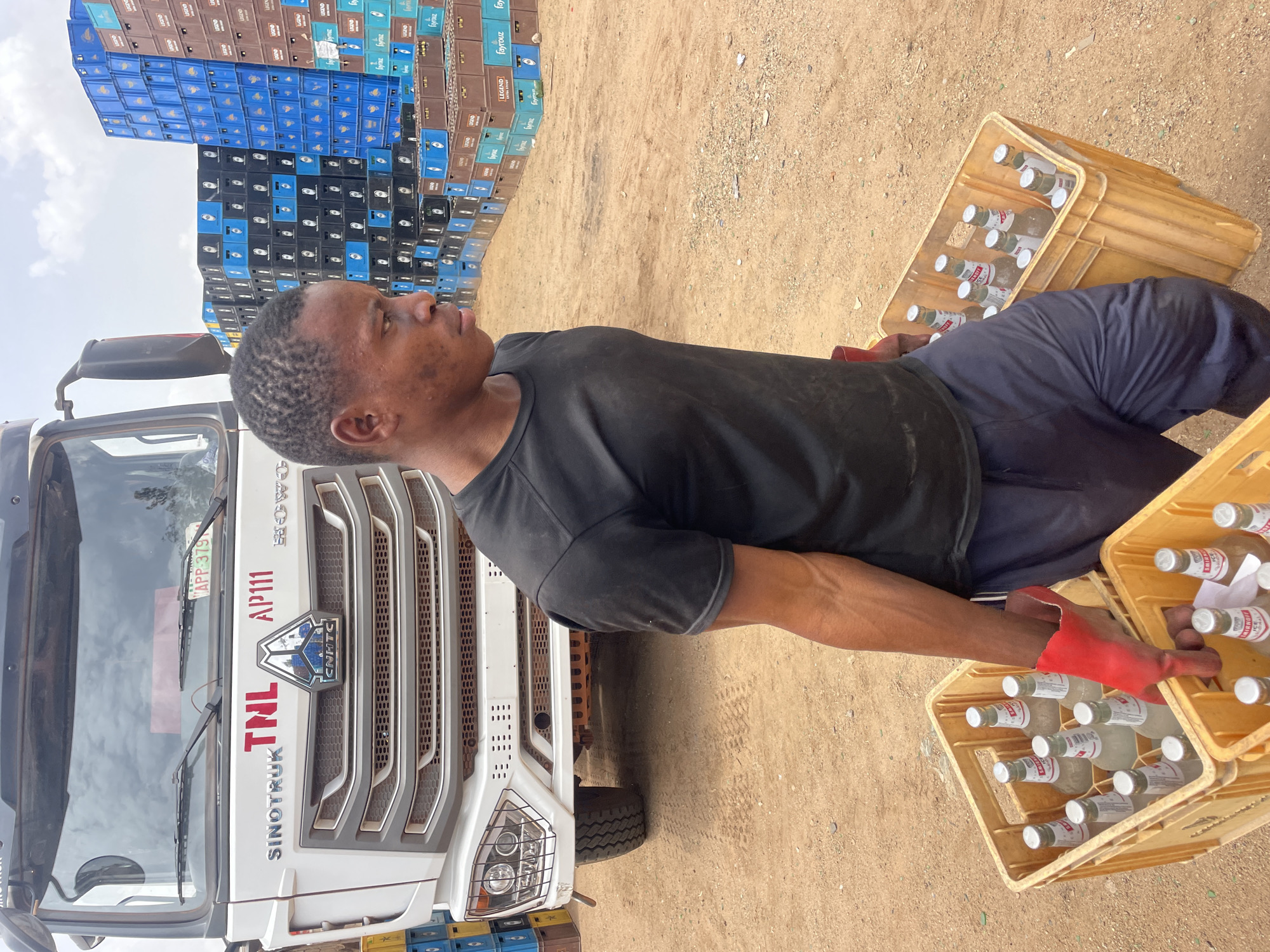 A man in a black shirt and dark pants carries two crates of clear glass bottles with silver tops, possibly filled with a beverage. He wears red gloves. The crates are light brown in color. He is standing next to the front of a white truck with "SINOTRUK" and "TNL" printed on it. The truck's license plate reads "AP111 WAPP-379". Behind the truck and man are stacks of crates of various colors, some labeled "LEGEND" and "Fayrouz." The ground is a dirt or sand surface. The photograph was most likely taken in Bukuru, Nigeria.