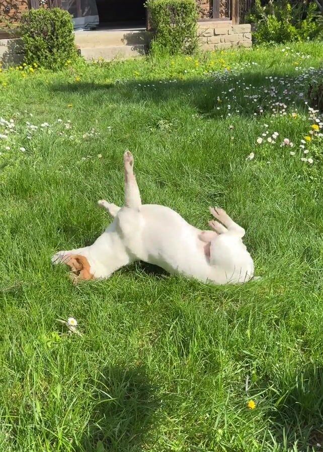 - "A white dog with tan and brown markings rolls in the grass" by FM-aQtHq2, licensed under CC BY 4.0
