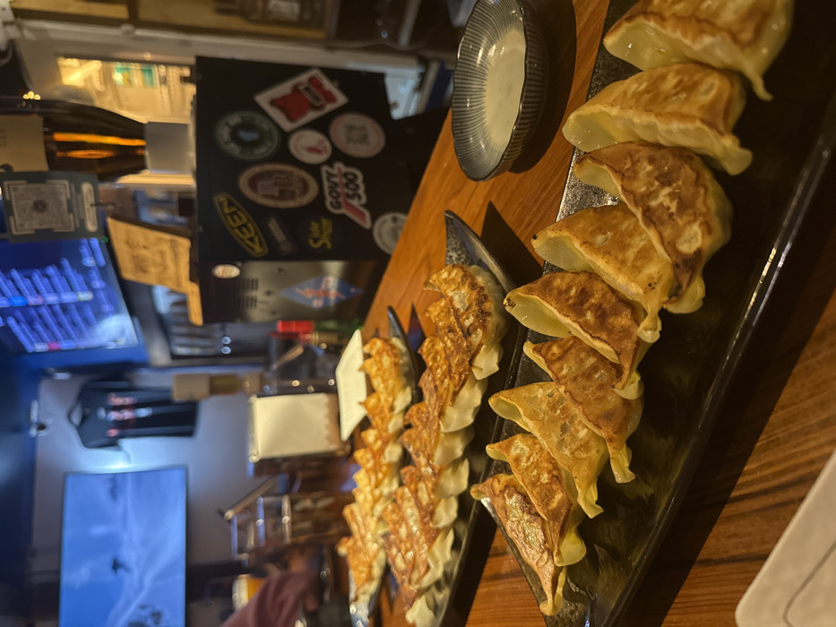 This image captures an interior view of Craftroom, a bar/restaurant located in Nozawaonsen, Japan, focusing on a wooden counter laden with food and drinks. In the foreground, three black rectangular plates are arranged on the polished wooden counter, each presenting approximately ten pan-fried gyoza. The gyoza exhibit a golden-brown, crispy bottom surface. To the right of the foremost plate, a small, fluted ceramic bowl contains a light-colored dipping sauce. In the midground, a person's left hand, partially visible on the far left, reaches towards a glass containing an amber beverage. Several other glasses, some holding similar amber liquid, are scattered along the counter. A white folded napkin or menu stands upright further back on the counter. The background reveals a bar area with a predominantly blue wall. Two flat-screen televisions are mounted on the wall; the left screen displays a snowy mountain landscape with a skier, while the right screen shows what appears to be a digital menu or information board with Japanese text. A black t-shirt with a red design hangs on the wall between the two screens. Below the televisions, a black utility unit or cooler is heavily adorned with various stickers, including prominent "KEEN," "GOVY 500," and "Slide Show" decals. Multiple beer taps and various bottles are visible behind the counter. The overall lighting is dim, suggesting an evening setting, with localized illumination on the counter and bar.