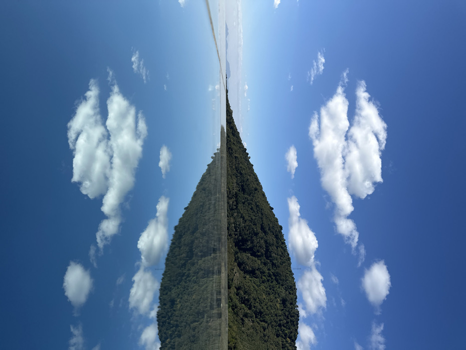 An abstract symmetrical view features a verdant hill juxtaposed with a clear blue sky adorned with scattered white clouds. The hill and sky appear mirrored along a central vertical axis. The clouds, resembling fluffy shapes, add texture to the sky. The hill is covered in dense green foliage, creating a sharp contrast with the blue expanse. A thin, light-colored strip runs along the base of the hill and the horizon, possibly a road.