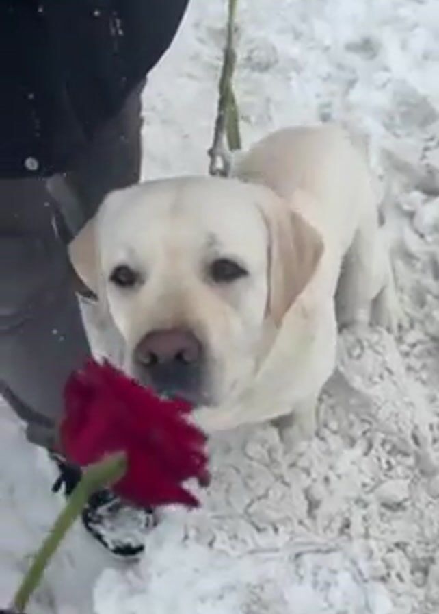 cream-colored Labrador retriever standing in the snow next to a person. The person is holding a red rose in front of the dog’s nose so it can smell the flower. The dog is wearing a green leash and looks at the camera and the rose. The person’s legs are visible, wearing gray pants and black and red hiking boots. The ground is covered in snow with some bare spots of dirt.