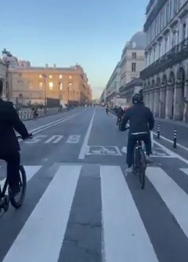 group of people riding bicycles on a city street with buildings on both sides. The sky is light blue. The road has white lane markings and crosswalks. The buildings are light colored, with windows and ornate details. The bicyclists are riding away from the camera, moving in the same direction.