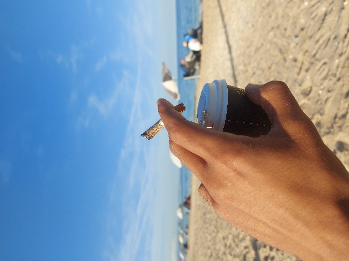 - "A close-up, first-person perspective photograph captured on a beach in M'diq, Morocco, depicts a light-skinned hand, likely male, holding a small, dark-colored disposable coffee cup with a white plastic lid in its palm" by FM-pNPMj1, licensed under CC BY 4.0