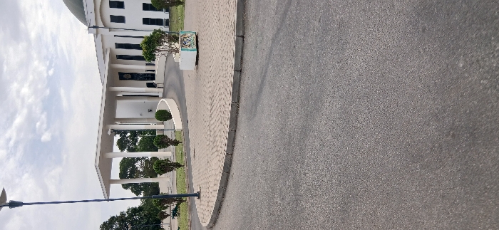 A building with white columns and a dome stands on the left side of the frame under a cloudy sky. The ground in front of the building is landscaped with small trees and shrubs. A brick walkway transitions into a grey asphalt road that dominates the right side of the image. A streetlight pole is visible in the lower left corner.
