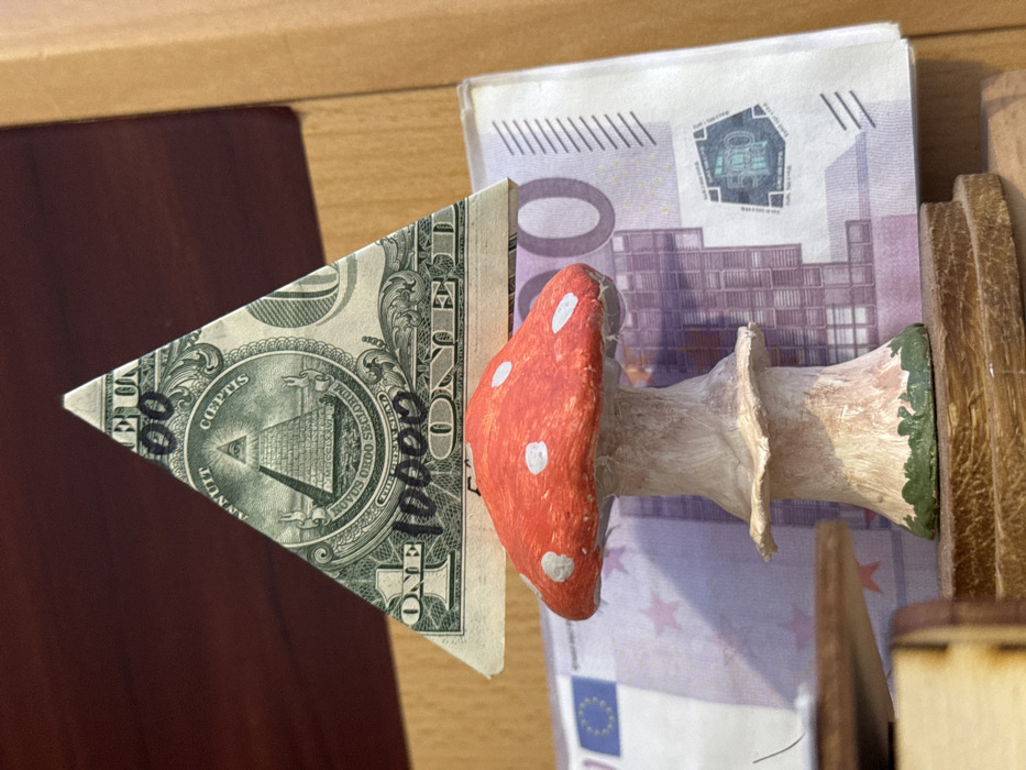 The scene, located in Ново-Никольское, Russia, depicts a static arrangement of several objects in a close-up view. Centrally positioned is a small, hand-painted mushroom figurine with a vibrant red cap featuring irregular white spots, a white stem, and a green-painted base. This figurine rests on a multi-tiered, light brown wooden base. Directly behind the mushroom, a United States one-dollar bill is folded into a triangular shape, standing upright. The reverse side of the dollar bill is visible, showcasing the Eye of Providence above a pyramid. Black handwritten numerals "00" are marked at the apex of the triangle, and "10000" is written across the base of the pyramid design. Below the dollar bill and behind the mushroom, a purple 500 Euro banknote is laid horizontally, with a portion of its face visible, displaying the large "500" numeral and security features. The background consists of a dark reddish-brown surface on the left and a lighter brown surface on the right, likely indicating furniture or a wall. The scene is illuminated by ambient indoor light. No individuals are present, and no actions or interactions are depicted beyond the physical arrangement of the objects.