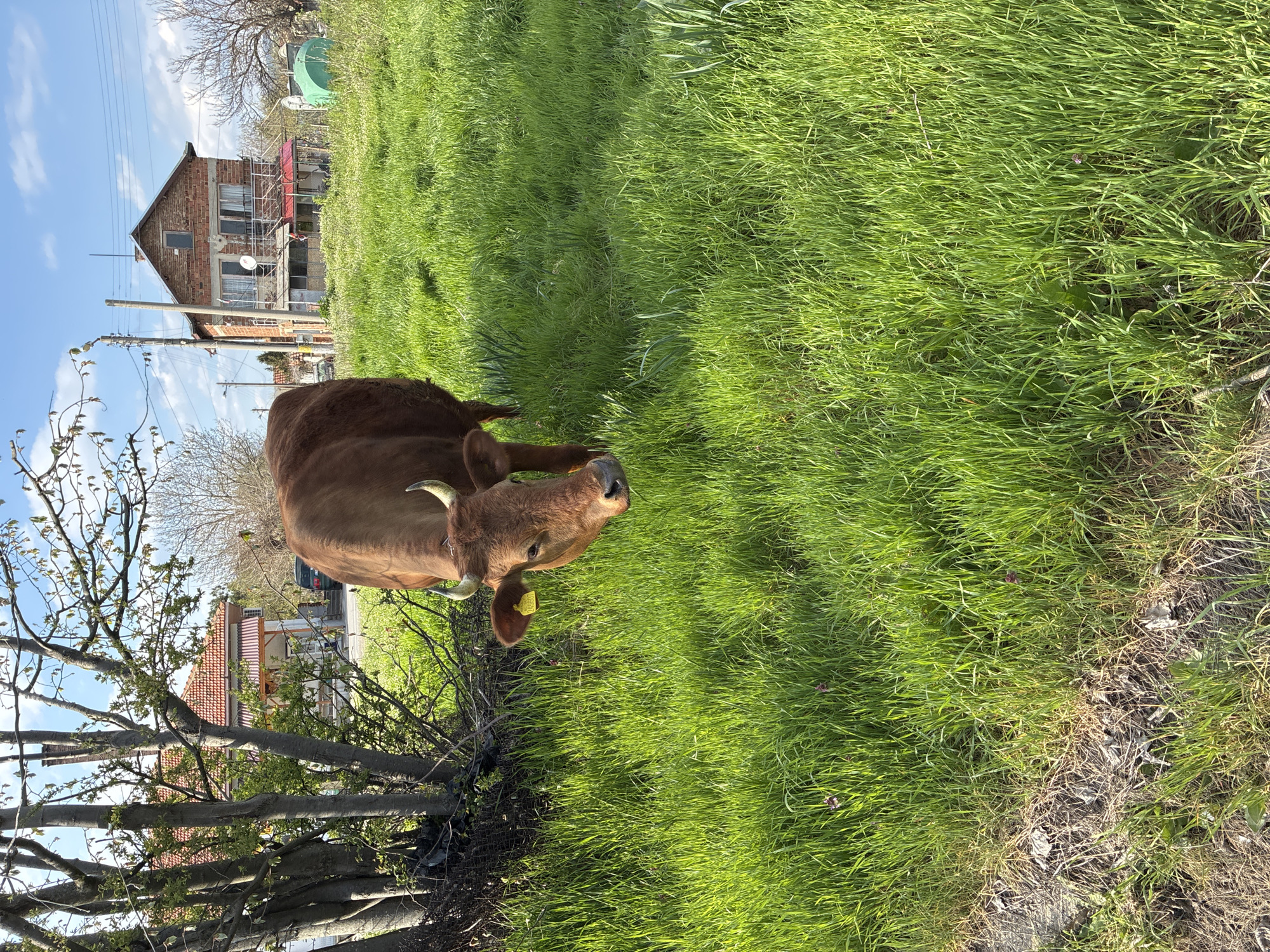 A cow lies on a field of green grass. The cow is reddish-brown with short horns and a yellow ear tag. In the background, there is a two-story brick building with scaffolding. Trees are visible in the foreground and background. Power lines are strung across the sky. The image was taken in Han Asparuhovo, Bulgaria.