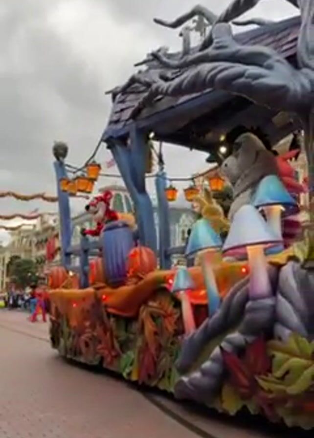 Halloween parade float at Disneyland, moving along a brick-paved street