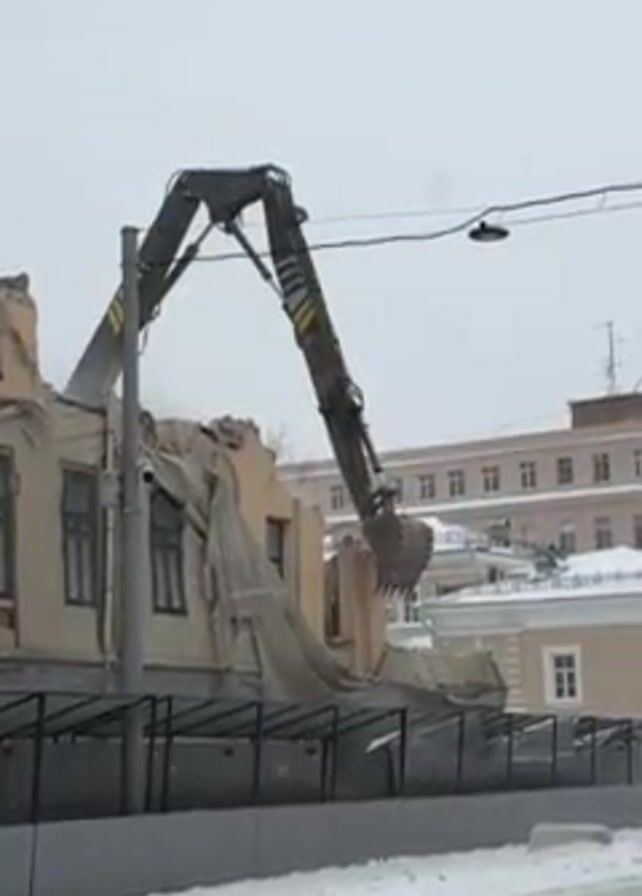 building being demolished. An excavator is used to tear down the roof of the building. The building is covered with a white mesh or tarp. The street is covered in snow. A fence surrounds the building. In the background are other buildings. It is a cloudy day.