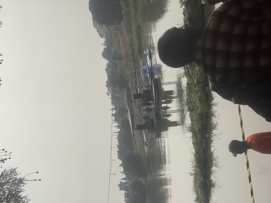 The image depicts an outdoor daytime scene at Jabi Lake in Abuja, Nigeria, characterized by a hazy, light-gray sky. A calm body of water occupies the mid-ground, reflecting structures on its surface. In the center of the lake, a rectangular floating platform, functioning as a stage, is visible. This platform features a green-framed canopy structure and is equipped with multiple large audio speakers mounted on metallic frames. Approximately 5-7 individuals are present on the platform, standing and appearing to be engaged with the setup or ongoing event. To the right of the platform, a blue and white inflatable recreational watercraft floats. The foreground shows a rocky and vegetated bank. A person, with their back to the camera, wearing a dark and red plaid shirt, is positioned on the right. To their left, another individual in an orange shirt and a dark baseball cap is partially visible, facing left. A segment of black and yellow caution tape is stretched horizontally near the water's edge in the lower-left. Overhead, in the upper-left quadrant, dark tree branches adorned with spherical decorations extend into the frame. A string of decorative lights with bare bulbs is suspended horizontally across the mid-ground, above the lake. The distant background features vegetated hillsides and dense foliage lining the far bank.