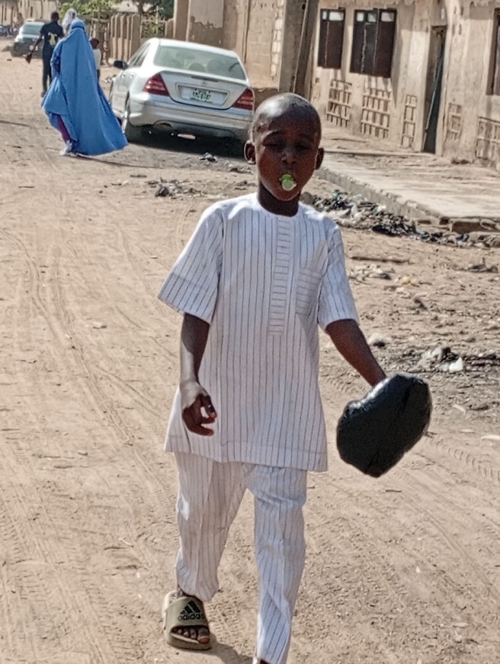 A young boy in a white striped outfit walks toward the camera with something round in his mouth and holding a large black object. He wears Adidas sandals. Behind him is a silver car, and a person in a full blue garment walks away from the camera. The scene is a sandy road with buildings in the background.