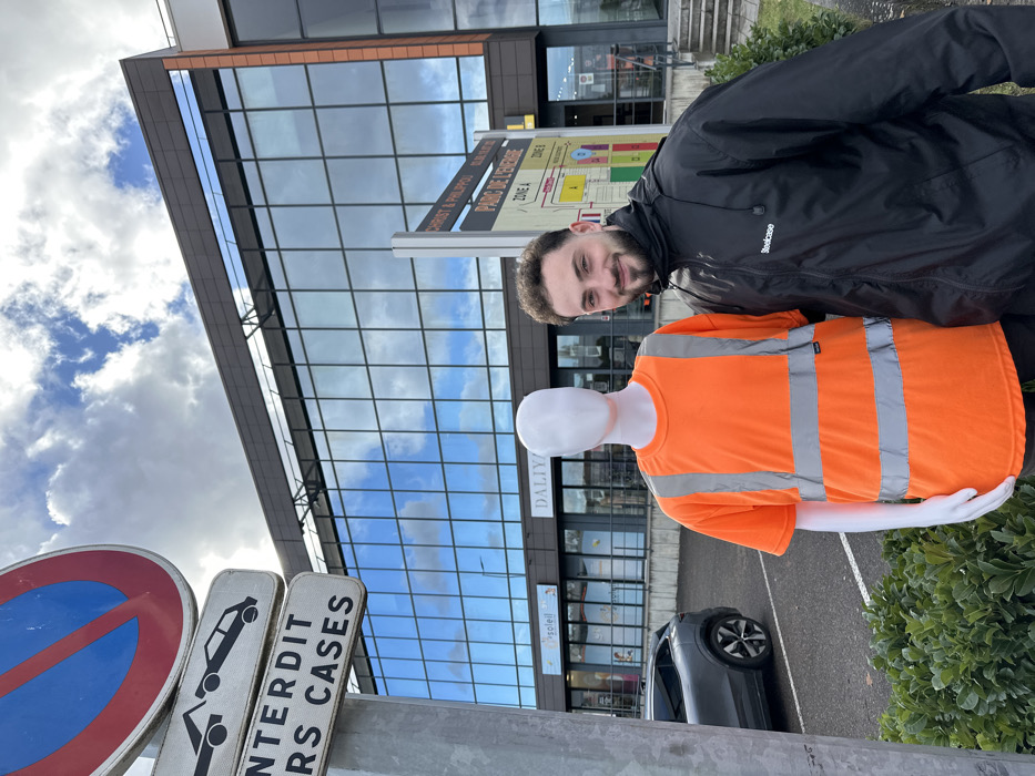 The image displays an outdoor scene in Bischheim, France. A male subject stands to the right of a white, headless mannequin. The man possesses a beard and dark hair, wearing a black hooded jacket with "Steelcase" branding. The mannequin is dressed in an orange short-sleeved t-shirt featuring horizontal and vertical reflective grey stripes. To the left, a grey pole supports a circular 'No Parking' sign, a rectangular sign depicting a tow truck, and a partially visible 'INTERDIT RS CASES' sign. The background features a multi-story building with a reflective glass facade and dark framing, reflecting a partly cloudy sky. Retail establishments, including 'DALIYA', are visible on the building's ground floor. To the right of the subjects, a directional signpost for 'PARC DE L'ENERGIE,' 'ZONE A,' 'ZONE B,' and 'CHRIST & PHILIPPOU' is present. A dark grey SUV is parked on the paved surface behind the subjects, with green bushes in the immediate foreground. The sky above is partly cloudy.