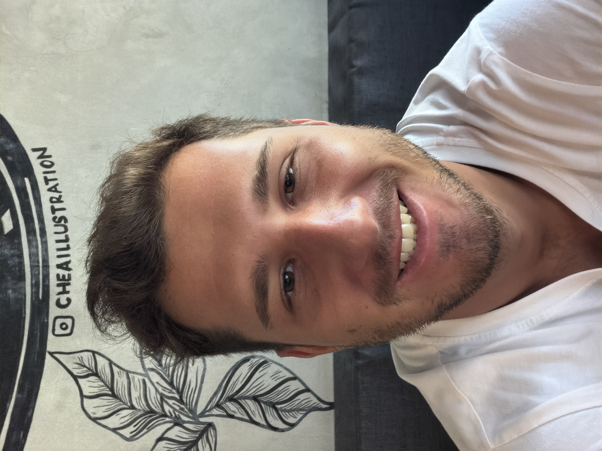A light-skinned male with brown hair and stubble is smiling at the camera. He is wearing a white t-shirt. To his left is a light-colored wall with a painted illustration of leaves and the Instagram handle "@CHEAILLUSTRATION". The setting appears to be indoors, possibly in Kerobokan Kelod, Indonesia based on the reference. A grey object is visible in the background behind his right shoulder.