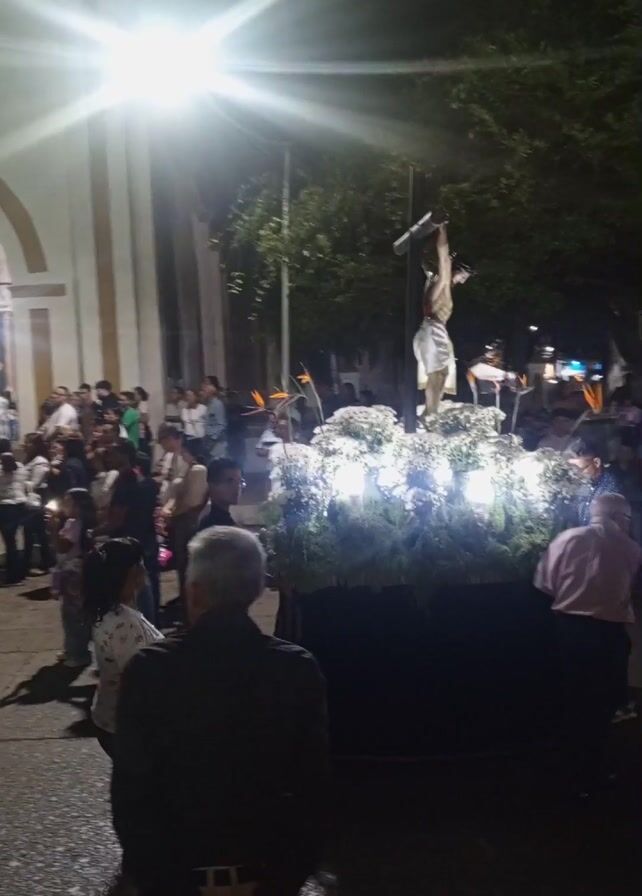 religious procession at night. A large crowd of people has gathered outside a white building with arches, crosses, and orange trim. Some people walk into the building, while others stand outside. In front of the crowd, a statue of a crucified Jesus is being carried on a platform decorated with white lights and greenery. As the video continues, the camera moves inside the building. There are two statues in the interior, one wearing green and one wearing purple. The crowd remains tightly packed.