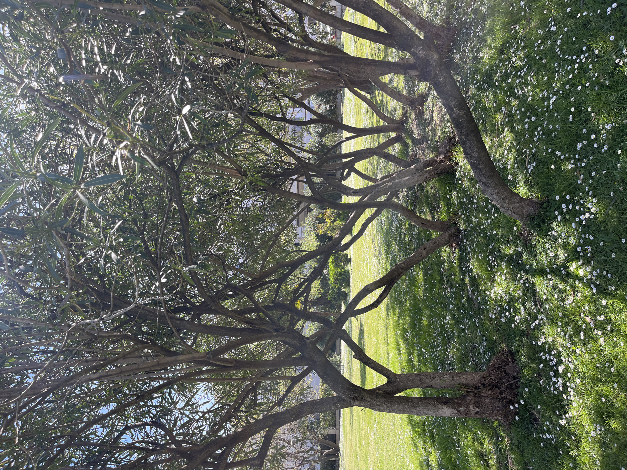 The image depicts a landscape scene in Budva, Montenegro. The foreground features a grassy area densely populated with small white daisies. Several trees with gnarled branches and slender green leaves stand across the scene, casting shadows on the ground. The branches of the trees intertwine, forming a canopy overhead. In the background, there are hints of buildings partially obscured by the foliage. The scene appears to be bathed in sunlight, with light filtering through the leaves, creating bright spots on the ground.