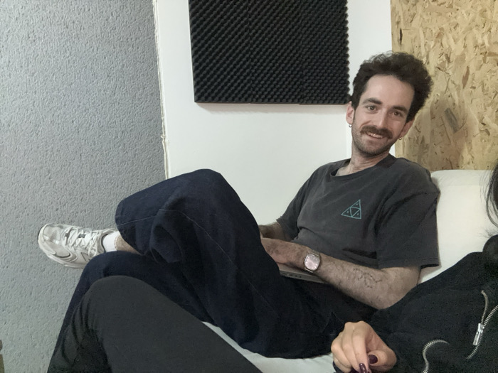 A man with dark hair and a mustache sits on a white couch with a laptop. He wears a gray t-shirt, dark blue pants, and white sneakers. A woman sits beside him, wearing a black jacket. A black soundproof panel is on the wall. The wall has two distinct textures: a textured gray panel on the left and a patterned wooden panel on the right. He is wearing a watch.