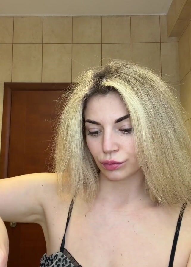 A young woman with fair skin and blonde, slightly disheveled hair is centered in the frame, removing makeup in a bathroom setting