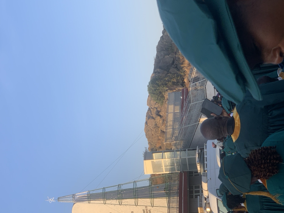 Graduates wearing green robes and caps attend an outdoor event. A rocky hill with railings is visible in the background. A tall white structure with a metal frame resembling a Christmas tree stands nearby. The sky is clear and blue. Some attendees are holding dark-colored tablets or books.