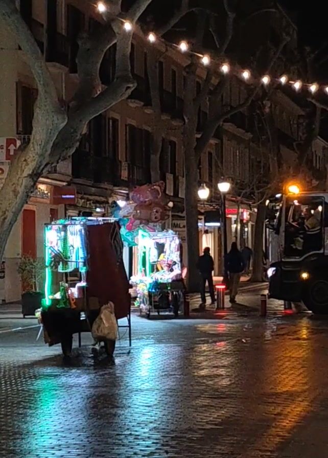 The camera captures a scene at night, likely in a town square or pedestrian street. A tree with bare branches is adorned with string lights, casting a warm glow. A vendor is present, with a cart decorated with vibrant neon lights, balloons, and other merchandise. The vendor is standing at the cart, possibly arranging items or waiting for customers. Several pedestrians walk along the wet, cobblestone street, which reflects the surrounding lights. In the background, there are buildings with visible windows and lit signs. A vehicle is parked further down the street, with its headlights illuminating the scene. The overall atmosphere is lively, due to the mix of lights and the movement of people.