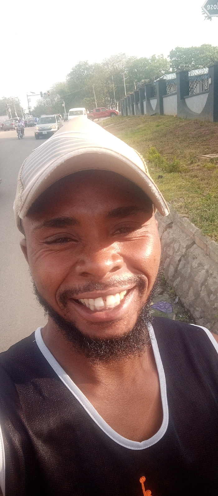 A male individual is depicted in a close-up, chest-up selfie, smiling directly towards the camera. He has dark skin, a beard, and is wearing a light-colored, striped baseball cap and a dark, sleeveless jersey with light trim. The setting is an outdoor street environment in Kubwa, Nigeria, under bright daylight. To the subject's left and extending into the background, an asphalt road is visible with vehicular traffic, including several cars, a white van, a red pickup truck, and a motorcycle carrying a rider. A traffic light structure, utility poles, and overhead lines are present along the road. To the subject's right, a stone-lined drainage ditch runs parallel to the road, bordered by a grassy embankment. Beyond this, a tall, dark-colored perimeter fence topped with barbed wire encloses a property, with trees visible behind it. A "920" watermark is present in the upper right corner of the image.