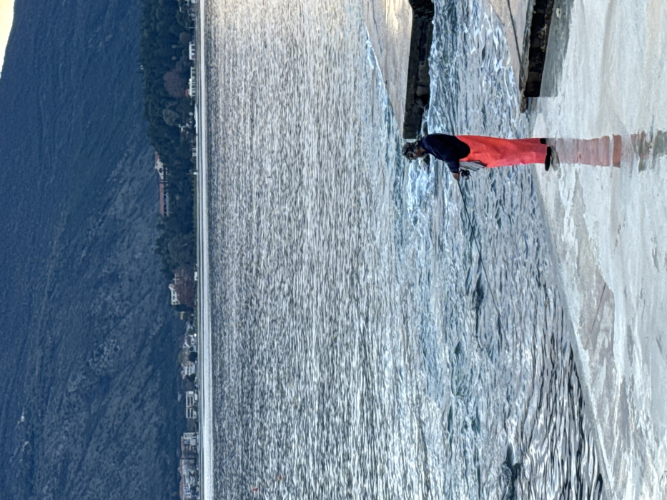 The scene captures an individual fishing from a concrete pier on the Bay of Kotor, within the vicinity of Herceg Novi, Montenegro