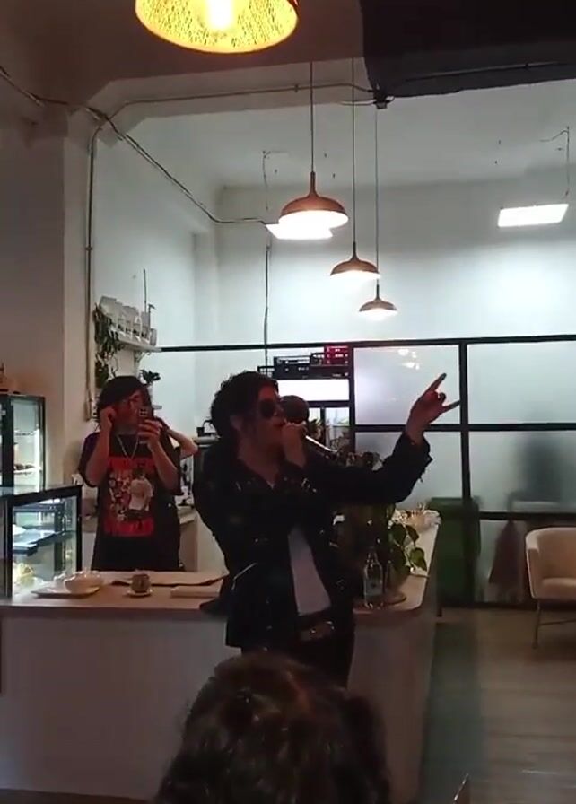 man singing in what appears to be a cafe or restaurant. He is wearing a black jacket and sunglasses, with his hair styled to resemble Michael Jackson. He holds a microphone and is gesturing with his hands while singing. Behind him, a person stands behind a counter taking a video with their phone. The cafe has a modern design with white walls, hanging lights, and a glass display case containing baked goods. There are patrons seated at tables in the foreground and background.