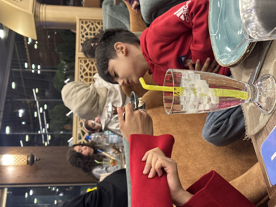 The image depicts an indoor scene within a restaurant or cafe located in Barza Municipality, Syria. In the foreground, a child, a male wearing a red Adidas hoodie, is seated on an orange-brown cushioned couch, looking upwards with his mouth slightly open. An unseen individual, whose hand in a red sleeve is visible on the left, is feeding the child with a spoon from a small metallic bowl. This individual is also holding a red, rectangular textured clutch or wallet. On the table in front of the child, a tall glass filled with water and ice contains a bright yellow, bent straw. A stack of blue ceramic plates is visible to the right, along with a beige woven placemat and a blue object resembling a phone case. In the midground, other patrons are visible: a young female with dark, curly hair is seated, drinking from a glass with a straw. Behind her, a person wearing a light-colored head covering (possibly a hijab) is partially obscured. Another small child with a pink headband is visible behind the person in the hijab. The background features large windows revealing blurred outdoor lights and dark shapes of trees or bushes. The interior includes warm lighting from a decorative hanging lantern, wooden paneling, and an ornate, light-colored wooden lattice screen or divider. The overall ambiance suggests an evening setting.