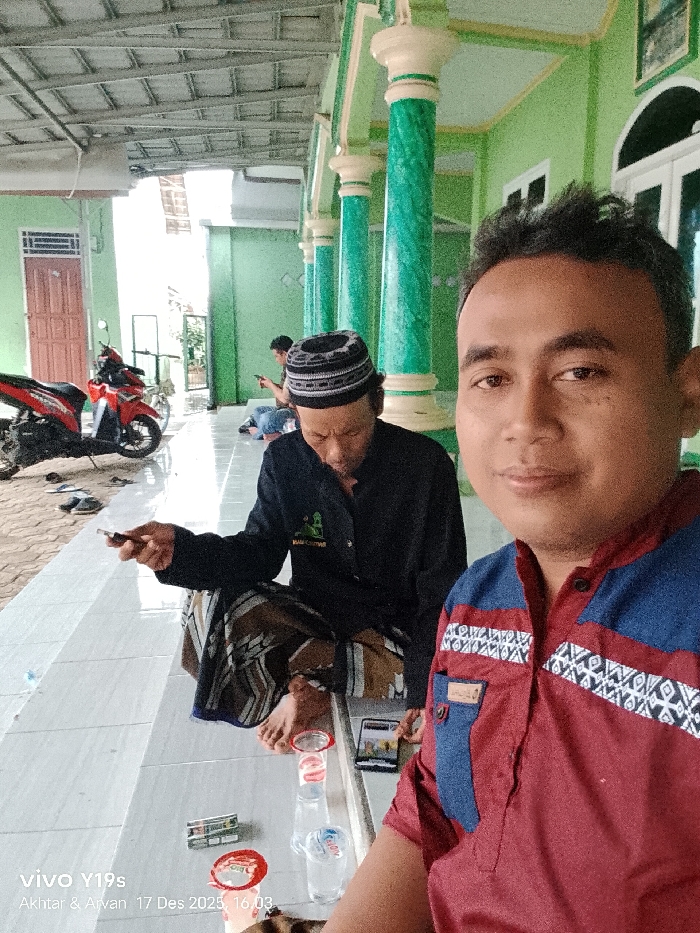 The image depicts a semi-outdoor covered walkway or porch of a building in Wanguk, Indonesia, on December 17, 2025, at 16:03. The primary subject, a male with dark hair, occupies the right foreground, capturing a selfie with a direct gaze at the camera. He wears a maroon and dark blue collared shirt featuring white geometric patterns. To his left, in the mid-ground, an older male is seated barefoot on the white tiled floor. He wears a black long-sleeved shirt with a light-colored logo on the left chest (partially readable as "MANAR KHOTTIMAN") and a brown, black, and white patterned sarong. He also wears a black and white woven peci cap and holds a small, dark rectangular object, possibly a mobile phone or vape, in his right hand, looking down at it. On the tiled floor between the two foreground subjects, a clear plastic water bottle, a clear plastic cup, and several small packaged items are visible. In the background, other individuals are visible further down the tiled walkway, also seated or resting. One man in the distant background appears to be looking at a phone. The building structure includes green-painted walls with white trim, large green and white striped pillars supporting a gray corrugated metal roof. A brown wooden door is visible on the far left of the background. Outside the tiled area, on a paved surface, a red and black scooter is parked, along with another less distinct vehicle. Several pairs of sandals or slippers are placed on the paved ground near the scooter.