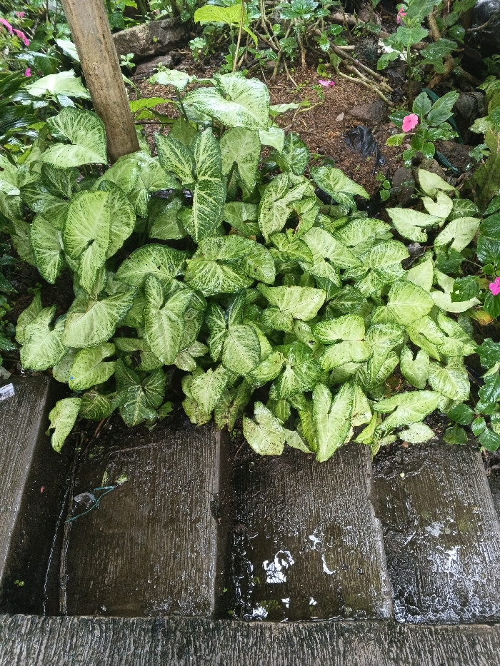 - "The scene depicts an outdoor environment in Bien Hoa, Vietnam, featuring a dense cluster of variegated green and white arrowhead plants (Syngonium podophyllum) dominating the central and upper-left portions of the frame" by FM-8Yrvl1, licensed under CC BY 4.0