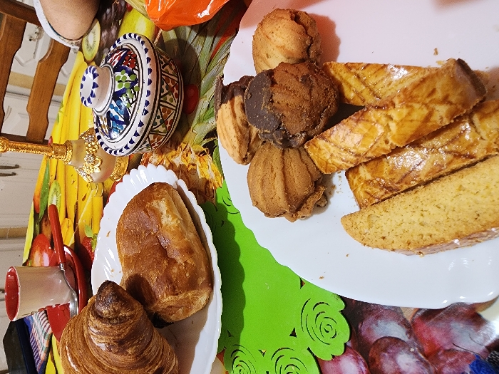 table setting with a variety of baked goods, including croissants, pastries, and cookies. The table is covered with a yellow tablecloth with a floral pattern. There are also a few green placemats on the table. The pastries are arranged on two white plates. There is a white ceramic teacup and saucer on the table. In the background, a person is sitting in a wooden chair. This scene is located in Birkhadem, Algeria, at the coordinates 36.709° N, 3.055° E.