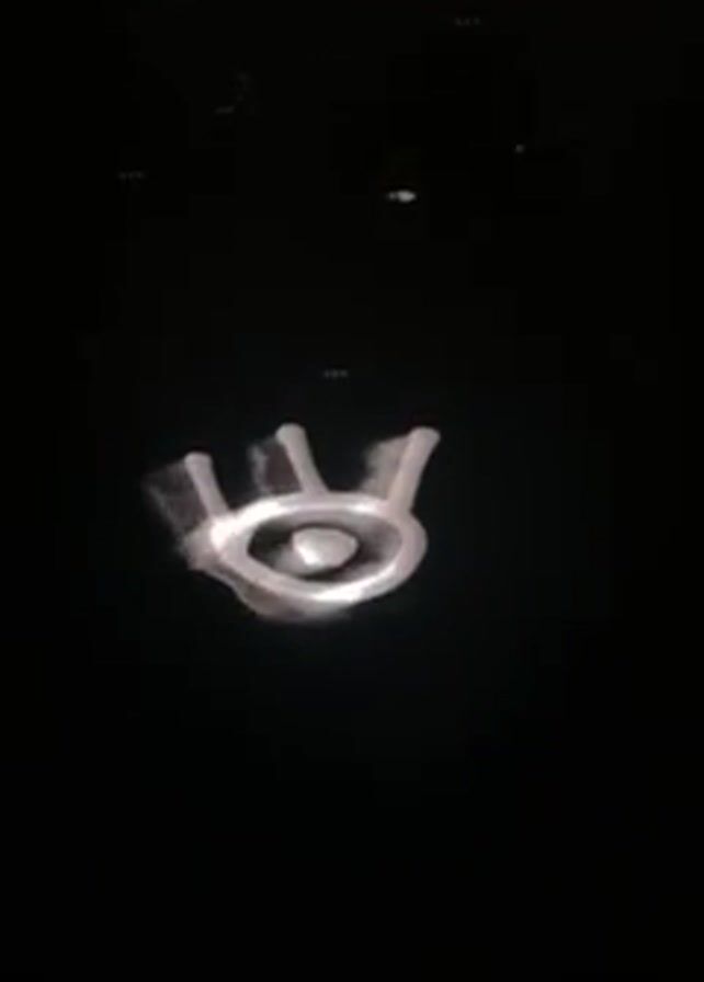 white symbol projected onto a dark surface. The symbol appears to be an eye shape with three short lines extending upwards from the top of the eye. The symbol is slightly blurry or hazy. There are also other faint light patterns visible in the background. Musical audio is present.